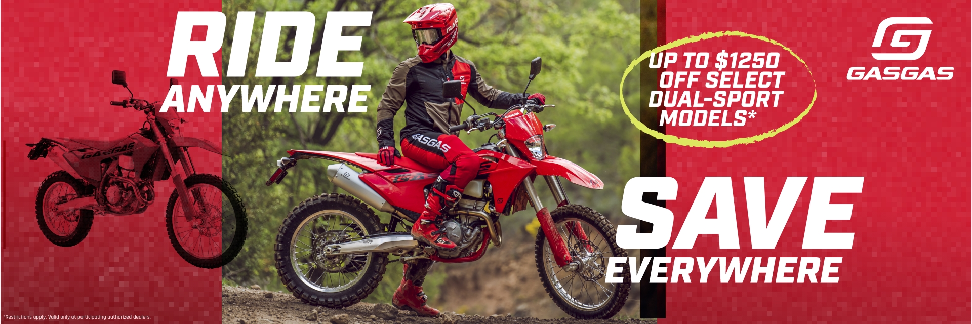 As low as 2.99% APR for up to 60 months on select new, untitled and unregistered 2024 GASGAS offroad GASGAS TXT Racing (250 / 300), TXT GP (250 / 300), MC-E (3 / 5), MC (50 / 65 / 85 (17/14 & 85 19/16) / 125 / 250 / 250F / 250F FACTORY EDITION / 350F / 450F / 450F FACTORY EDITION), EX (250 / 300 / 250F / 350F / 450F), EC (250 / 300 / 450F), EW 500, ES (350 / 500 / 700) and SM 700 model motorcycles. Financing offer available through FreedomRoad Financial (FRF), a loan production center of Evergreen Bank Group, Member FDIC. Where no money down is indicated, it is available only to those well-qualified applicants with approved credit. Annual Percentage Rates (APR) of 2.99% for up to 60 months or 4.99% for up to 60 months, and no down payment offers available to qualified applicants only. Not all buyers will qualify and if approved may receive a higher rate and higher payment, depending on credit score. Some buyers will require a higher down payment in order to receive credit approval. Other charges may apply. Subject to model availability and dealer participation. Subject to credit approval by FRF, not all applicants will qualify. Financing offer can change or be cancelled at any time. Offer valid October 20, 2025, through December 31, 2025. This offer cannot be combined with any other offers. Finance offer valid through authorized GASGAS dealers only. See local authorized dealer for details.